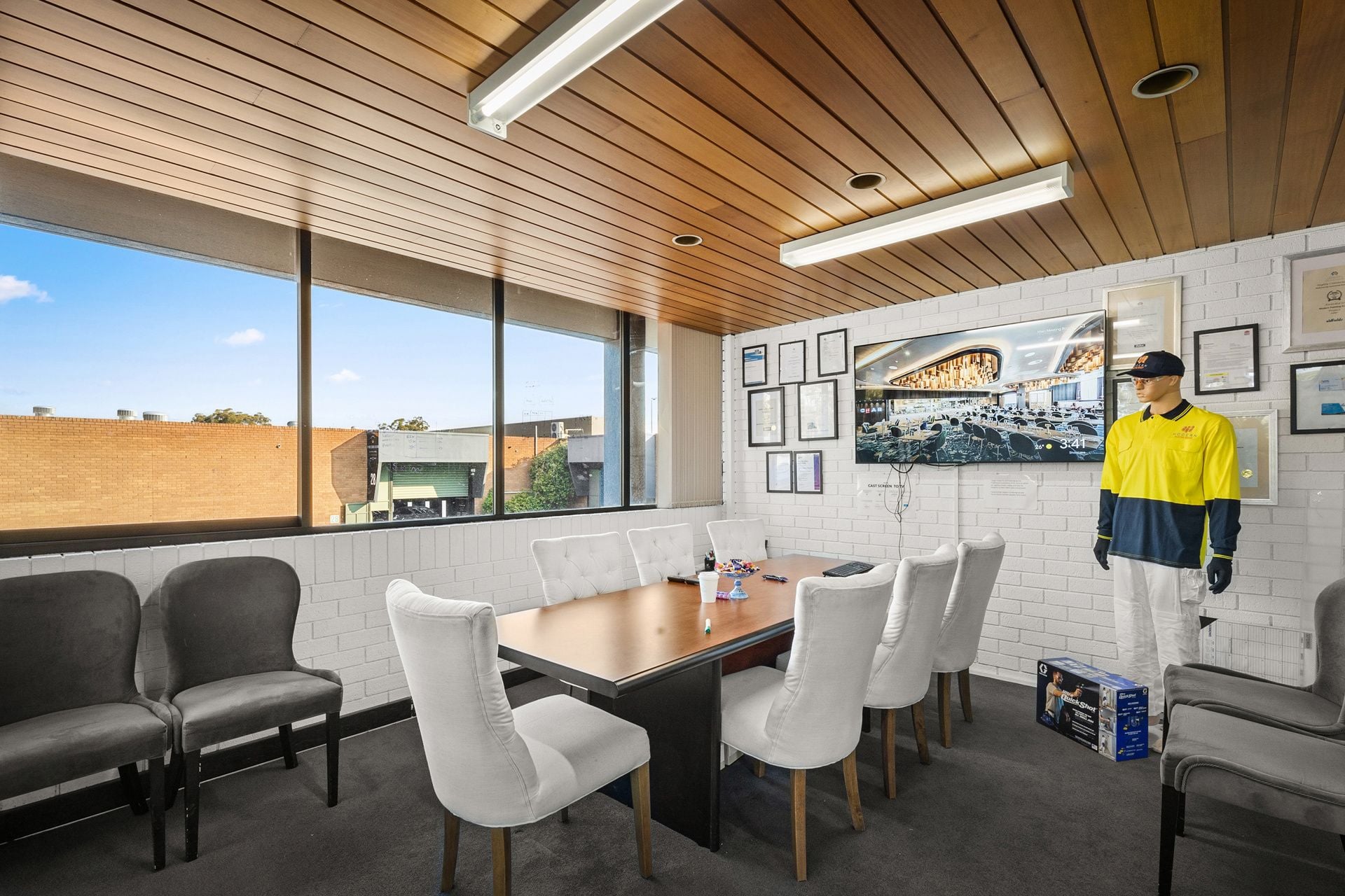 Large open showroom drenched with natural light from two sides of glass, plus opening windows great for fresh air.